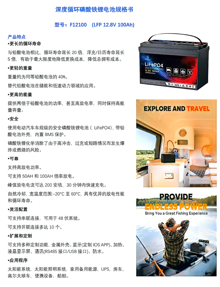 F12100_LiFePO4-12.8V-100Ah,专业提供高端锂电池组及智能充电系统的定制服务,致力于为客户打造高效、安全、智能的能源解决方案,满足多样化应用需求。