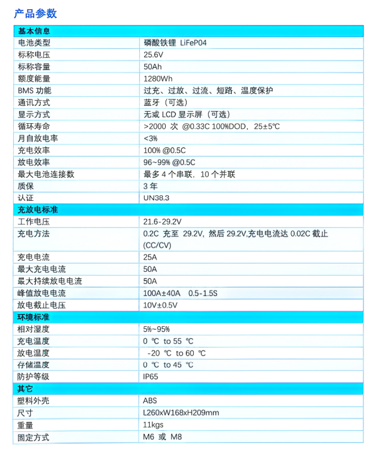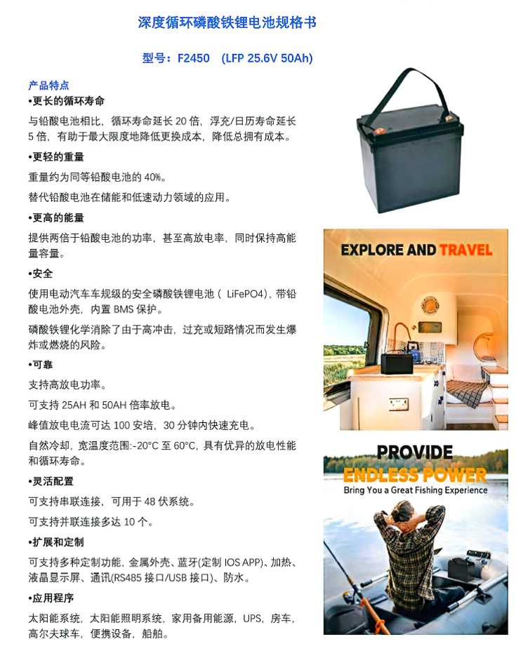 F2450_LiFePO4-25.6V-50Ah,专业提供高端锂电池组及智能充电系统的定制服务,致力于为客户打造高效、安全、智能的能源解决方案,满足多样化应用需求。